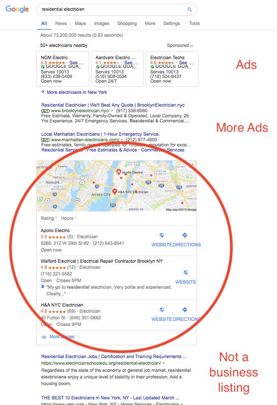 When a user searches for your industry or niche (like “Electrician”), they will possibly see ads at the top of Google, and then they will see a map. Below that map is going to be what is called: the Google Local 3 Pack.